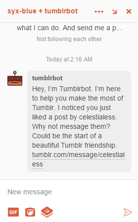 {{ soooooooo this just happened. Like okay tumblrbot, but @celestialess is already my gf and messaging each other on here is literally how we met. You’re a little late to the party there… }}